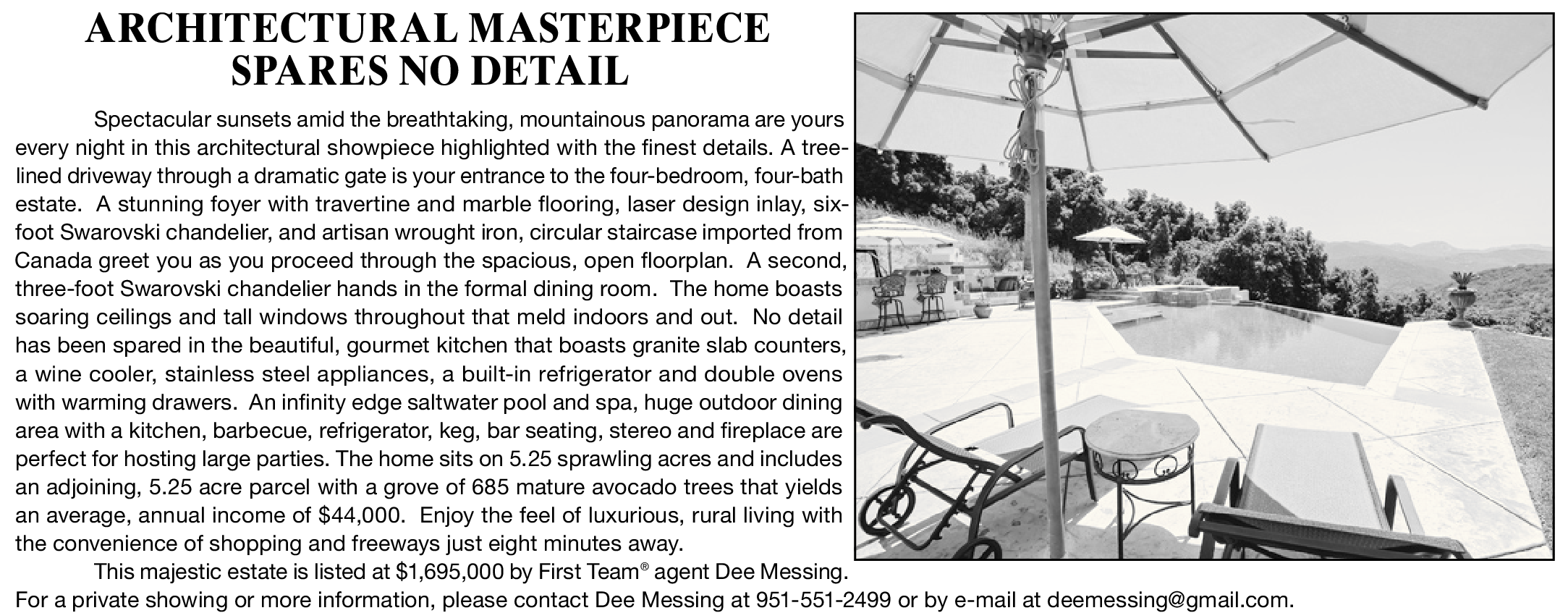 ARCHITECTURAL MASTERPIECE SPARES NO DETAIL Spectacular sunsets amid the breathtaking, mountainous panorama are yours every night in this architectural showpiece highlighted with the finest details. A treelined driveway through a dramatic gate is your entrance to the four-bedroom, four-bath estate. A stunning foyer with travertine and marble flooring, laser design inlay, sixfoot Swarovski chandelier, and artisan wrought iron, circular staircase imported from Canada greet you as you proceed through the spacious, open floorplan. A second, three-foot Swarovski chandelier hands in the formal dining room. The home boasts soaring ceilings and tall windows throughout that meld indoors and out. No detail has been spared in the beautiful, gourmet kitchen that boasts granite slab counters, a wine cooler, stainless steel appliances, a built-in refrigerator and double ovens with warming drawers. An infinity edge saltwater pool and spa, huge outdoor dining area with a kitchen, barbecue, refrigerator, keg, bar seating, stereo and fireplace are perfect for hosting large parties. The home sits on 5.25 sprawling acres and includes an adjoining, 5.25 acre parcel with a grove of 685 mature avocado trees that yields an average, annual income of $44,000. Enjoy the feel of luxurious, rural living with the convenience of shopping and freeways just eight minutes away. This majestic estate is listed at $1,695,000 by First Team ® agent Dee Messing. For a private showing or more information, please contact Dee Messing at 951-551-2499 or by e-mail at deemessing@gmail.com.