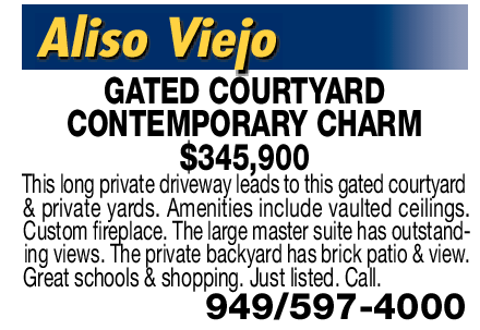 Aliso Viejo GATED COURTYARD CONTEMPORARY CHARM $345,900 This long private driveway leads to this gated courtyard & private yards. Amenities include vaulted ceilings. Custom fireplace. The large master suite has outstanding views. The private backyard has brick patio & view. Great schools & shopping. Just listed. Call. 949/597-4000