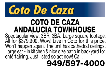 Coto De Caza COTO DE CAZA ANDALUCIA TOWNHOUSE Spectacular view. 3BR, 3BA. Large square footage. All for $379,900. Wow! Live in Coto for this price. Won’t happen again. The unit has cathedral ceilings. Large eat - in kitchen & nice size patio in backyard for entertaining. Just listed so act now! Call. 949/597-4000
