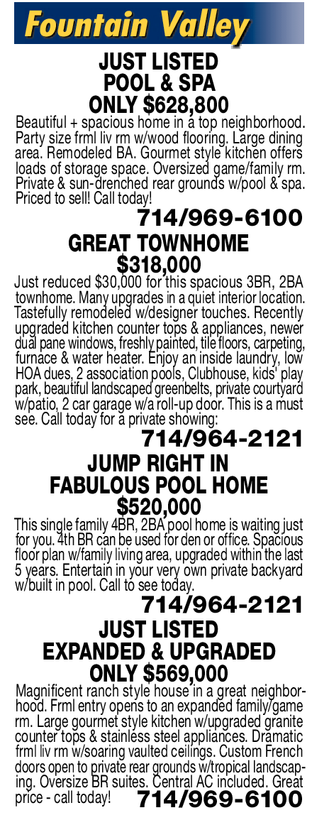714/969-6100 GREAT TOWNHOME $318,000 Just reduced $30,000 for this spacious 3BR, 2BA townhome. Many upgrades in a quiet interior location. Tastefully remodeled w/designer touches. Recently upgraded kitchen counter tops & appliances, newer dual pane windows, freshly painted, tile floors, carpeting, furnace & water heater. Enjoy an inside laundry, low HOA dues, 2 association pools, Clubhouse, kids' play park, beautiful landscaped greenbelts, private courtyard w/patio, 2 car garage w/a roll-up door. This is a must see. Call today for a private showing: