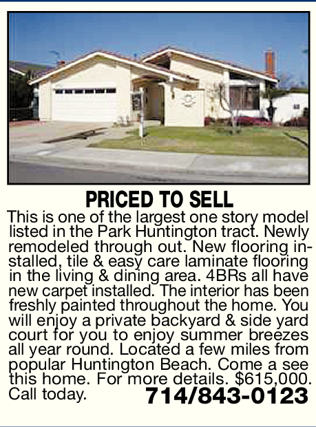 PRICED TO SELL This is one of the largest one story model listed in the Park Huntington tract. Newly remodeled through out. New flooring installed, tile & easy care laminate flooring in the living & dining area. 4BRs all have new carpet installed. The interior has been freshly painted throughout the home. You will enjoy a private backyard & side yard court for you to enjoy summer breezes all year round. Located a few miles from popular Huntington Beach. Come a see this home. For more details. $615,000. Call today. 714/843-0123