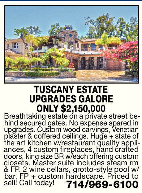 TUSCANY ESTATE UPGRADES GALORE ONLY $2,150,000 Breathtaking estate on a private street behind secured gates. No expense spared in upgrades. Custom wood carvings, Venetian plaster & coffered ceilings. Huge + state of the art kitchen w/restaurant quality appliances, 4 custom fireplaces, hand crafted doors, king size BR w/each offering custom closets. Master suite includes steam rm & FP. 2 wine cellars, grotto-style pool w/ bar, FP + custom hardscape. Priced to sell! Call today! 714/969-6100