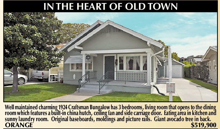 Well maintained charming 1924 Craftsman Bungalow has 3 bedrooms, living room that opens to the dining room which features a built-in china hutch, ceiling fan and side carriage door. Eating area in kitchen and sunny laundry room. Original baseboards, moldings and picture rails. Giant avocado tree in back. ORANGE $519,900