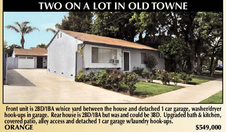 Front unit is 2BD/1BA w/nice yard between the house and detached 1 car garage, washer/dryer hook-ups in garage. Rear house is 2BD/1BA but was and could be 3BD. Upgraded bath & kitchen, covered patio, alley access and detached 1 car garage w/laundry hook-ups. ORANGE $549,000