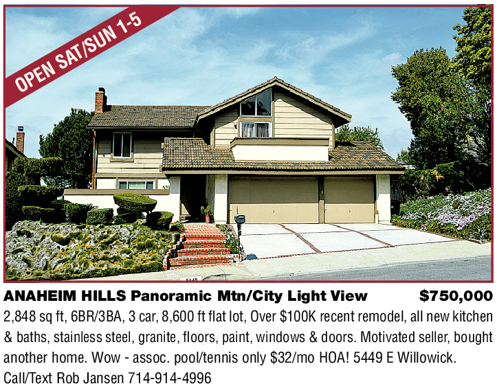 ANAHEIM HILLS Panoramic Mtn/City Light View $750,000 2,848 sq ft, 6BR/3BA, 3 car, 8,600 ft flat lot, Over $100K recent remodel, all new kitchen & baths, stainless steel, granite, floors, paint, windows & doors. Motivated seller, bought another home. Wow - assoc. pool/tennis only $32/mo HOA! 5449 E Willowick. Call/Text Rob Jansen 714-914-4996