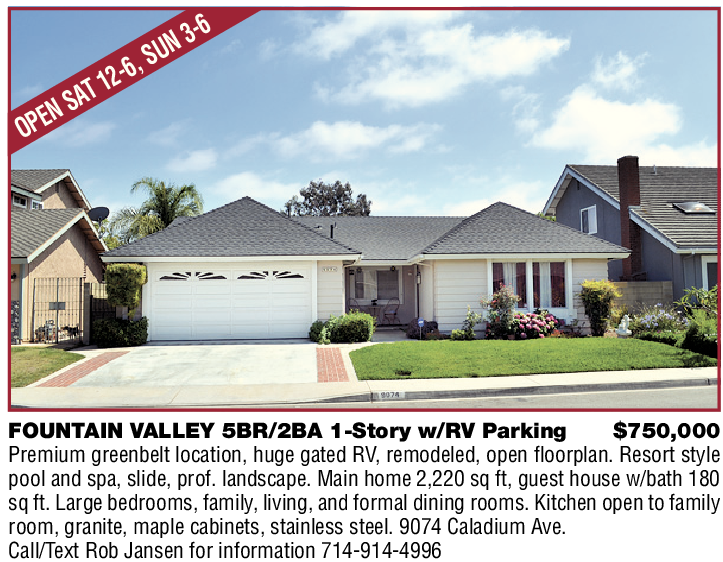 FOUNTAIN VALLEY 5BR/2BA 1-Story w/RV Parking $750,000 Premium greenbelt location, huge gated RV, remodeled, open floorplan. Resort style pool and spa, slide, prof. landscape. Main home 2,220 sq ft, guest house w/bath 180 sq ft. Large bedrooms, family, living, and formal dining rooms. Kitchen open to family room, granite, maple cabinets, stainless steel. 9074 Caladium Ave. Call/Text Rob Jansen for information 714-914-4996