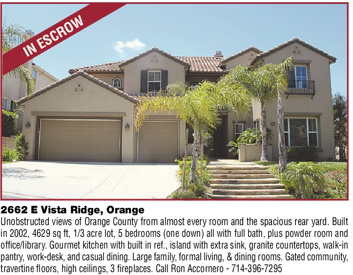 2662 E Vista Ridge, Orange Unobstructed views of Orange County from almost every room and the spacious rear yard. Built in 2002, 4629 sq ft, 1/3 acre lot, 5 bedrooms (one down) all with full bath, plus powder room and offi ce/library. Gourmet kitchen with built in ref., island with extra sink, granite countertops, walk-in pantry, work-desk, and casual dining. Large family, formal living, & dining rooms. Gated community, travertine floors, high ceilings, 3 fi replaces. Call Ron Accornero - 714-396-7295