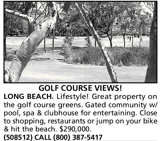 LONG BEACH. Lifestyle! Great property on the golf course greens. Gated community w/ pool, spa & clubhouse for entertaining. Close to shopping, restaurants or jump on your bike & hit the beach. $290,000. (508512) CALL (800) 387-5417