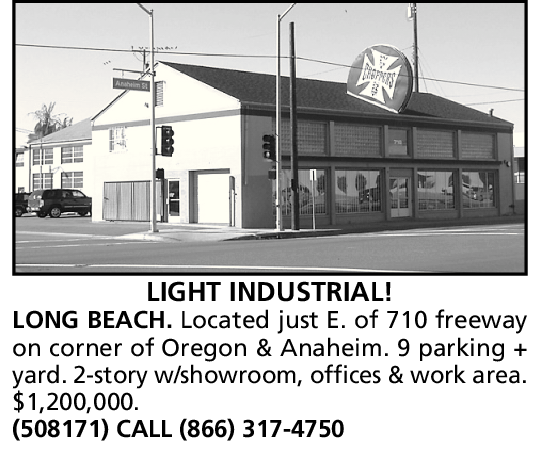 LONG BEACH. Located just E. of 710 freeway on corner of Oregon & Anaheim. 9 parking + yard. 2-story w/showroom, offices & work area. $1,200,000. (508171) CALL (866) 317-4750