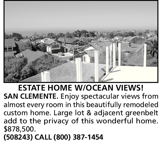 SAN CLEMENTE. Enjoy spectacular views from almost every room in this beautifully remodeled custom home. Large lot & adjacent greenbelt add to the privacy of this wonderful home. $878,500. (508243) CALL (800) 387-1454