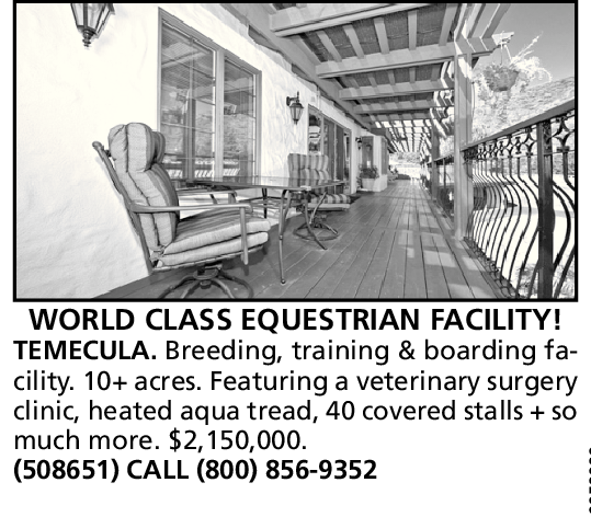 TEMECULA. Breeding, training & boarding facility. 10+ acres. Featuring a veterinary surgery clinic, heated aqua tread, 40 covered stalls + so much more. $2,150,000. (508651) CALL (800) 856-9352