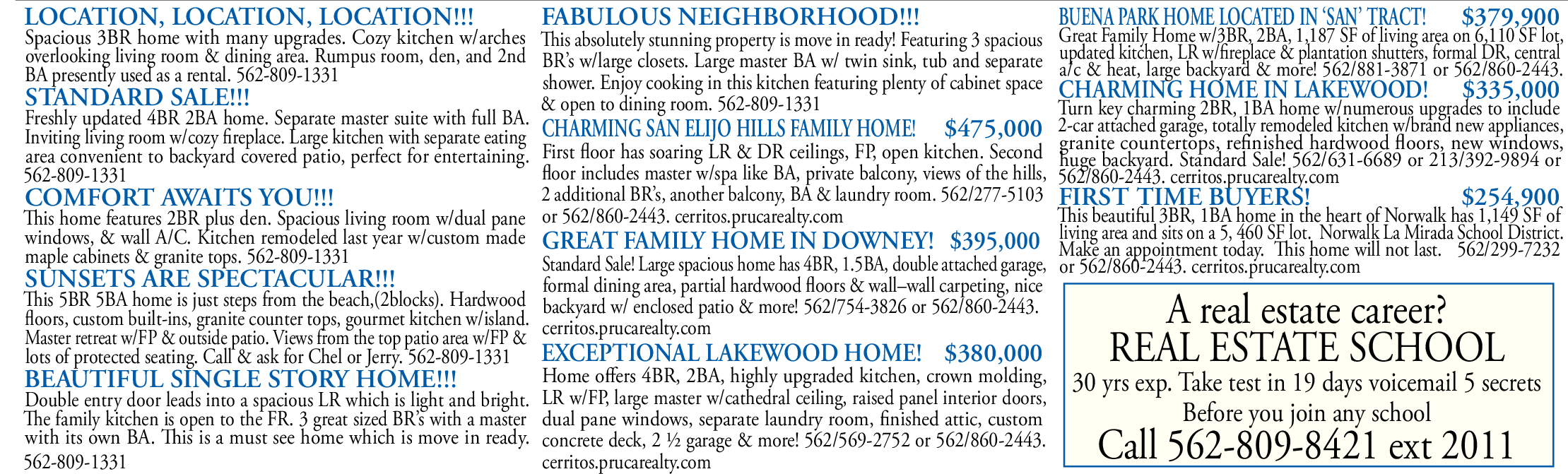 This absolutely stunning property is move in ready! Featuring 3 spacious BR’s w/large closets. Large master BA w/ twin sink, tub and separate shower. Enjoy cooking in this kitchen featuring plenty of cabinet space & open to dining room. 562-809-1331 CHARMING SAN ELIJO HILLS FAMILY HOME! $475,000 First floor has soaring LR & DR ceilings, FP, open kitchen. Second floor includes master w/spa like BA, private balcony, views of the hills, 2 additional BR’s, another balcony, BA & laundry room. 562/277-5103 or 562/860-2443. cerritos.prucarealty.com GREAT FAMILY HOME IN DOWNEY! $395,000 Standard Sale! Large spacious home has 4BR, 1.5BA, double attached garage, formal dining area, partial hardwood floors & wall–wall carpeting, nice backyard w/ enclosed patio & more! 562/754-3826 or 562/860-2443. cerritos.prucarealty.com EXCEPTIONAL LAKEWOOD HOME! $380,000 Home offers 4BR, 2BA, highly upgraded kitchen, crown molding, LR w/FP, large master w/cathedral ceiling, raised panel interior doors, dual pane windows, separate laundry room, finished attic, custom concrete deck, 2 ½ garage & more! 562/569-2752 or 562/860-2443. cerritos.prucarealty.com