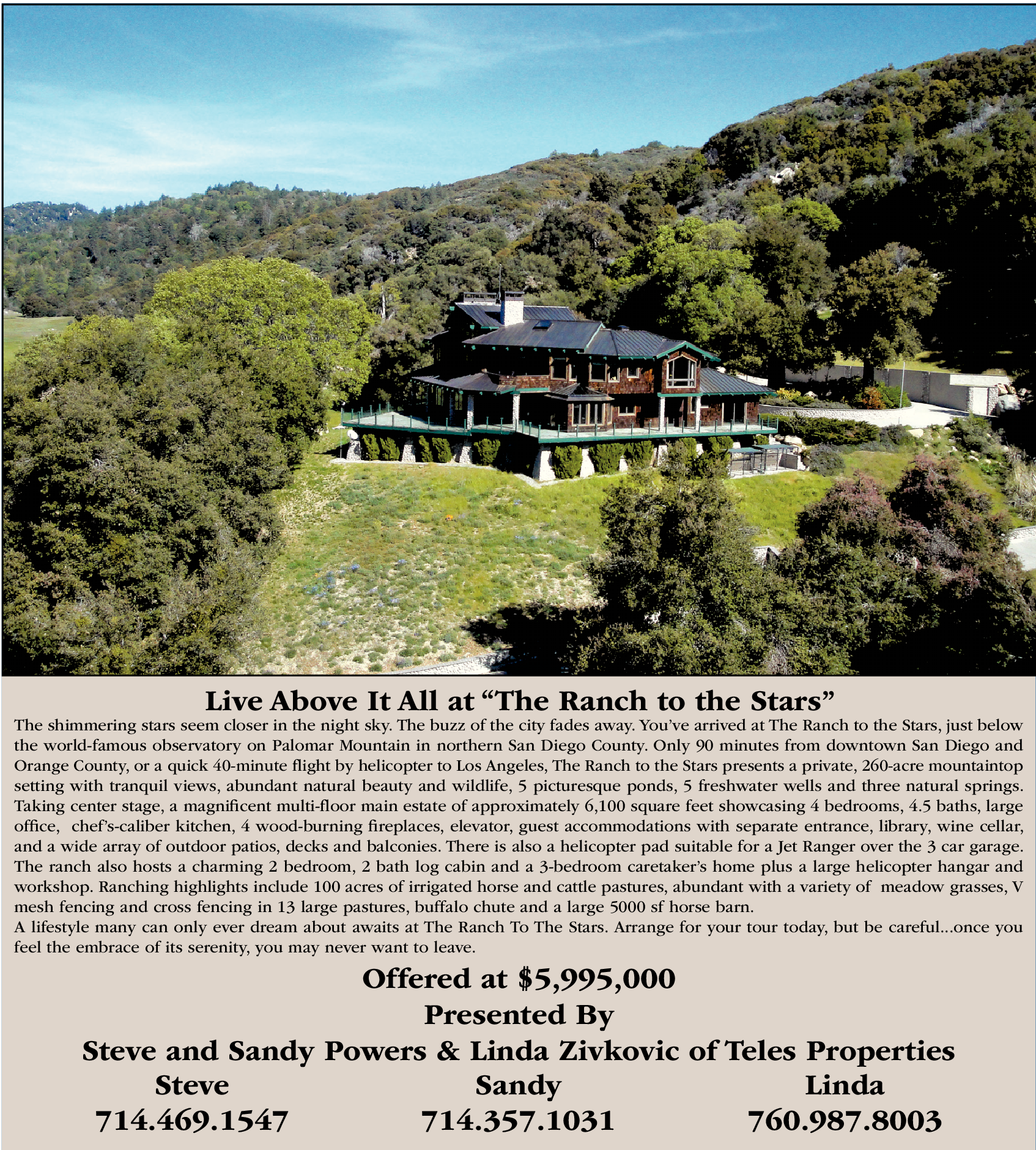 The shimmering stars seem closer in the night sky. The buzz of the city fades away. You’ve arrived at The Ranch to the Stars, just below the world-famous observatory on Palomar Mountain in northern San Diego County. Only 90 minutes from downtown San Diego and Orange County, or a quick 40-minute flight by helicopter to Los Angeles, The Ranch to the Stars presents a private, 260-acre mountaintop setting with tranquil views, abundant natural beauty and wildlife, 5 picturesque ponds, 5 freshwater wells and three natural springs. Taking center stage, a magnificent multi-floor main estate of approximately 6,100 square feet showcasing 4 bedrooms, 4.5 baths, large office, chef’s-caliber kitchen, 4 wood-burning fireplaces, elevator, guest accommodations with separate entrance, library, wine cellar, and a wide array of outdoor patios, decks and balconies. There is also a helicopter pad suitable for a Jet Ranger over the 3 car garage. The ranch also hosts a charming 2 bedroom, 2 bath log cabin and a 3-bedroom caretaker’s home plus a large helicopter hangar and workshop. Ranching highlights include 100 acres of irrigated horse and cattle pastures, abundant with a variety of meadow grasses, V mesh fencing and cross fencing in 13 large pastures, buffalo chute and a large 5000 sf horse barn. A lifestyle many can only ever dream about awaits at The Ranch To The Stars. Arrange for your tour today, but be careful...once you feel the embrace of its serenity, you may never want to leave.
