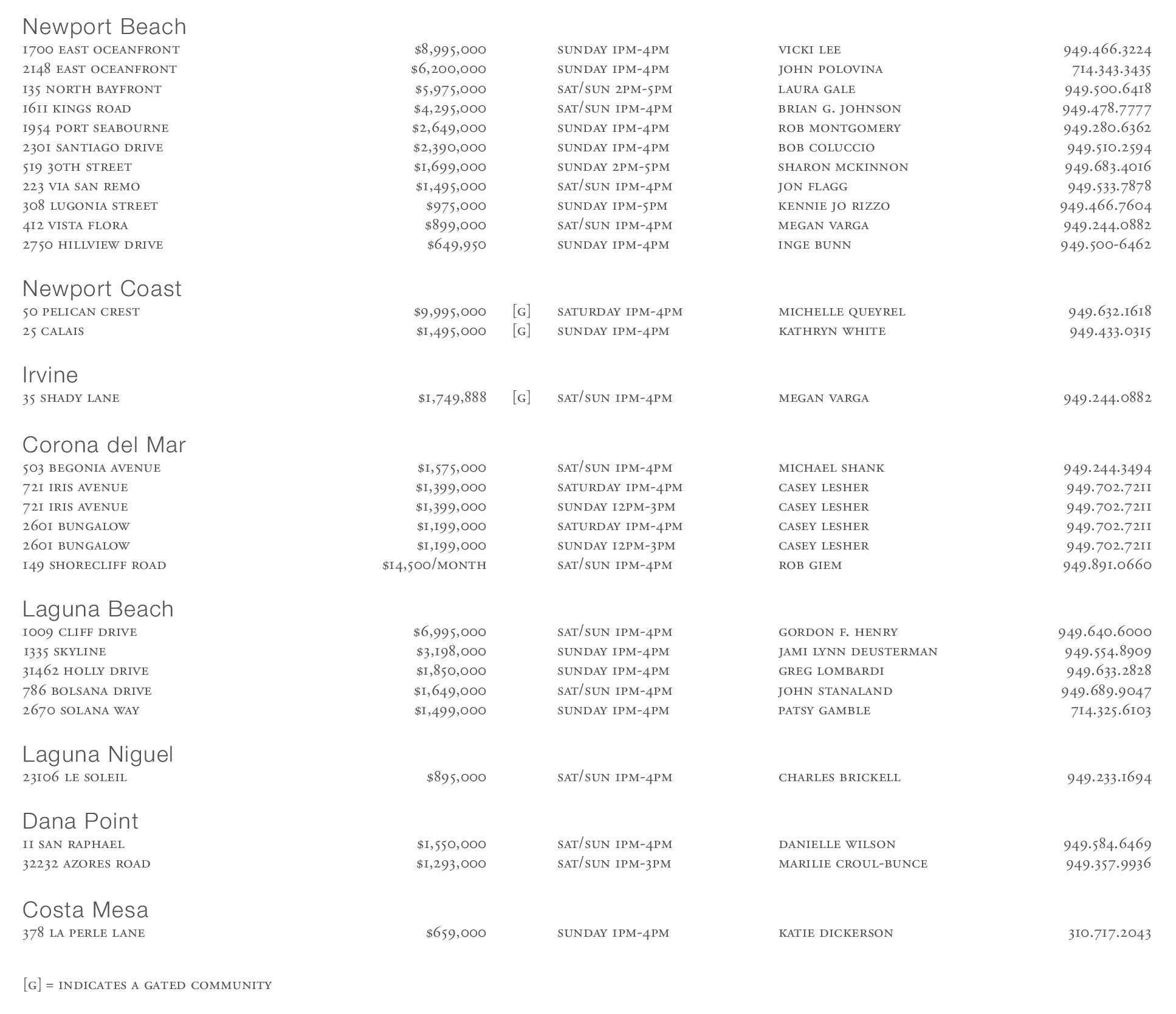 Newport Coast 50 pelican crest $9,995,000 [g] saturday 1pm-4pm michelle queyrel 949.632.1618 25 calais $1,495,000 [g] sunday 1pm-4pm kathryn white 949.433.0315