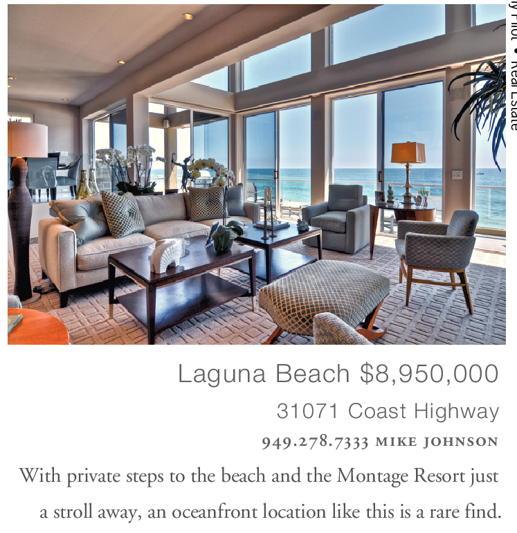 Laguna Beach $8,950,000 31071 Coast Highway 949.278.7333 mike johnson With private steps to the beach and the Montage Resort just a stroll away, an oceanfront location like this is a rare find.