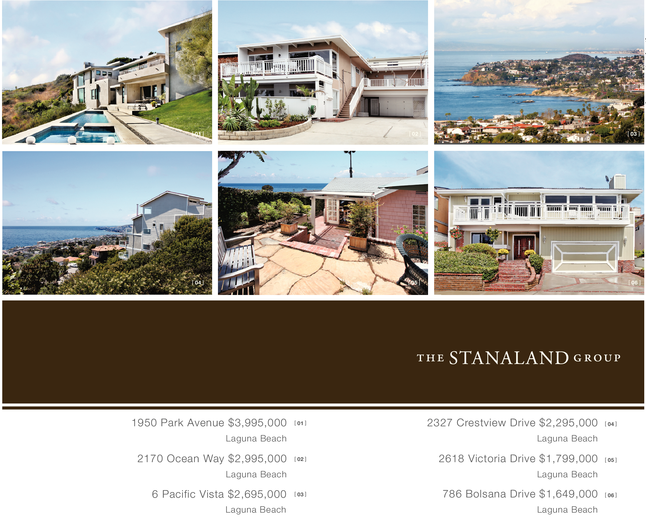 [ 01 ] [ 02 ] [ 04 ] [ 05 ] 1950 Park Avenue $3,995,000 Laguna Beach 2170 Ocean Way $2,995,000 Laguna Beach 6 Pacific Vista $2,695,000 Laguna Beach [ 01 ] [ 02 ] [ 03 ] 2327 Crestview Drive $2,295,000 Laguna Beach 2618 Victoria Drive $1,799,000 Laguna Beach 786 Bolsana Drive $1,649,000 Laguna Beach [ 04 ] [ 05 ] [ 06 ] [ 03 ] [ 06 ]