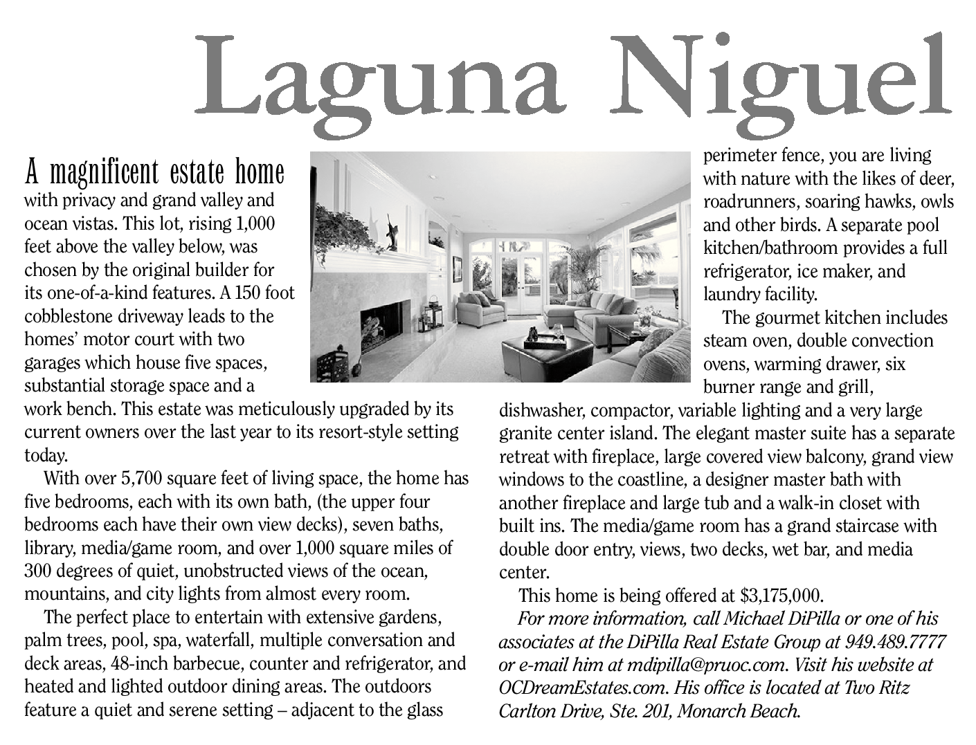 This home is being offered at $3,175,000. For more information, call Michael DiPilla or one of his associates at the DiPilla Real Estate Group at 949.489.7777 or e-mail him at mdipilla@pruoc.com. Visit his website at OCDreamEstates.com. His office is located at Two Ritz Carlton Drive, Ste. 201, Monarch Beach.