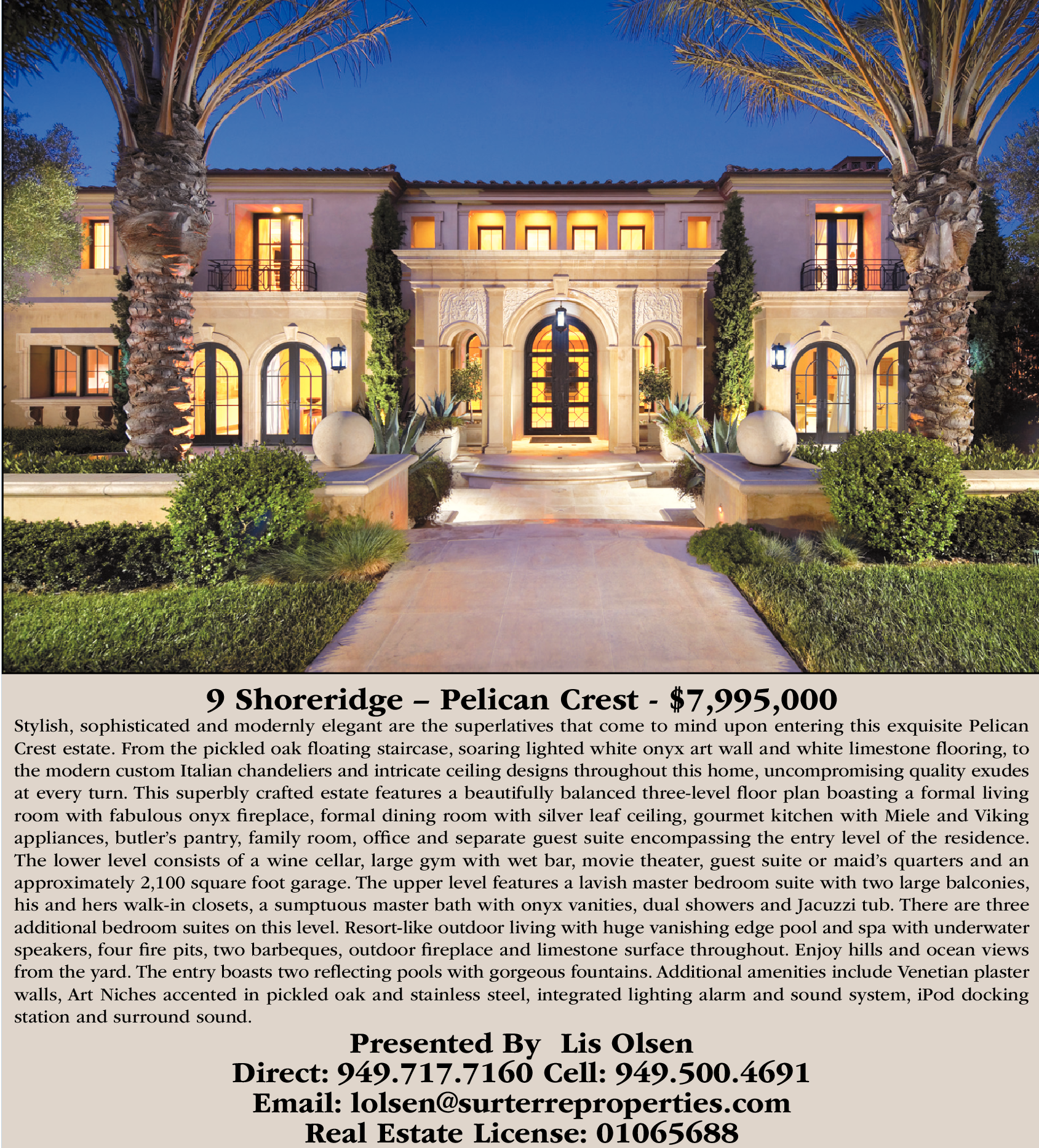 9 Shoreridge – Pelican Crest - $7,995,000 Stylish, sophisticated and modernly elegant are the superlatives that come to mind upon entering this exquisite Pelican Crest estate. From the pickled oak floating staircase, soaring lighted white onyx art wall and white limestone flooring, to the modern custom Italian chandeliers and intricate ceiling designs throughout this home, uncompromising quality exudes at every turn. This superbly crafted estate features a beautifully balanced three-level floor plan boasting a formal living room with fabulous onyx fireplace, formal dining room with silver leaf ceiling, gourmet kitchen with Miele and Viking appliances, butler’s pantry, family room, office and separate guest suite encompassing the entry level of the residence. The lower level consists of a wine cellar, large gym with wet bar, movie theater, guest suite or maid’s quarters and an approximately 2,100 square foot garage. The upper level features a lavish master bedroom suite with two large balconies, his and hers walk-in closets, a sumptuous master bath with onyx vanities, dual showers and Jacuzzi tub. There are three additional bedroom suites on this level. Resort-like outdoor living with huge vanishing edge pool and spa with underwater speakers, four fire pits, two barbeques, outdoor fireplace and limestone surface throughout. Enjoy hills and ocean views from the yard. The entry boasts two reflecting pools with gorgeous fountains. Additional amenities include Venetian plaster walls, Art Niches accented in pickled oak and stainless steel, integrated lighting alarm and sound system, iPod docking station and surround sound. Presented By Lis Olsen Direct: 949.717.7160 Cell: 949.500.4691 Email: lolsen@surterreproperties.com Real Estate License: 01065688