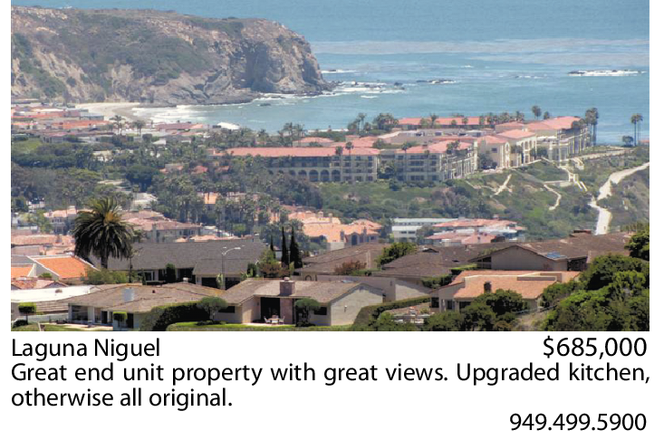 Laguna Niguel $685,000 Great end unit property with great views. Upgraded kitchen, otherwise all original.