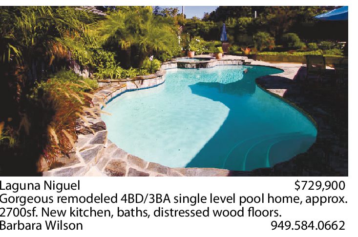 Laguna Niguel $729,900 Gorgeous remodeled 4BD/3BA single level pool home, approx. 2700sf. New kitchen, baths, distressed wood floors. Barbara Wilson 949.584.0662