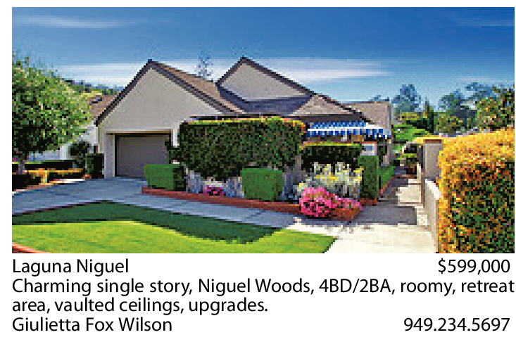 Laguna Niguel $599,000 Charming single story, Niguel Woods, 4BD/2BA, roomy, retreat area, vaulted ceilings, upgrades. Giulietta Fox Wilson 949.234.5697