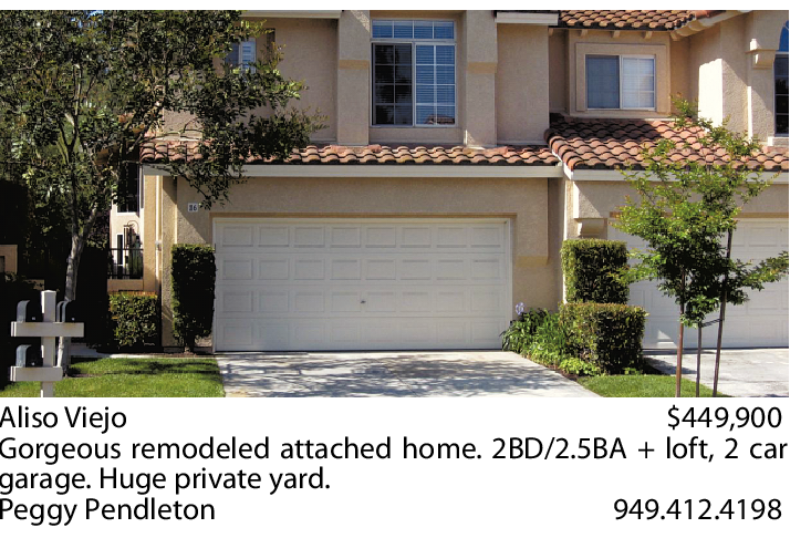 Aliso Viejo $449,900 Gorgeous remodeled attached home. 2BD/2.5BA + loft, 2 car garage. Huge private yard. Peggy Pendleton 949.412.4198