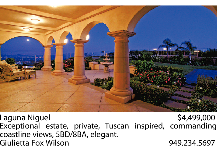 Laguna Niguel $4,499,000 Exceptional estate, private, Tuscan inspired, commanding coastline views, 5BD/8BA, elegant. Giulietta Fox Wilson 949.234.5697