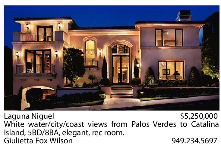 Laguna Niguel $5,250,000 White water/city/coast views from Palos Verdes to Catalina Island, 5BD/8BA, elegant, rec room. Giulietta Fox Wilson 949.234.5697