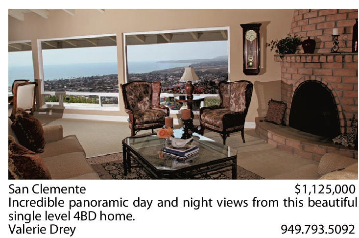 San Clemente $1,125,000 Incredible panoramic day and night views from this beautiful single level 4BD home. Valerie Drey 949.793.5092
