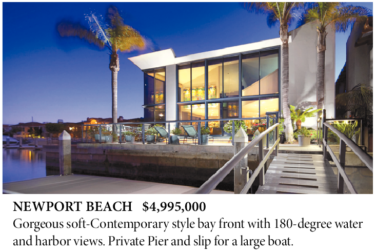 NEWPORT BEACH $4,995,000 Gorgeous soft-Contemporary style bay front with 180-degree water and harbor views. Private Pier and slip for a large boat.