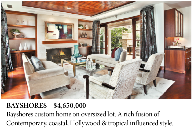 BAYSHORES $4,650,000 Bayshores custom home on oversized lot. A rich fusion of Contemporary, coastal, Hollywood & tropical influenced style.