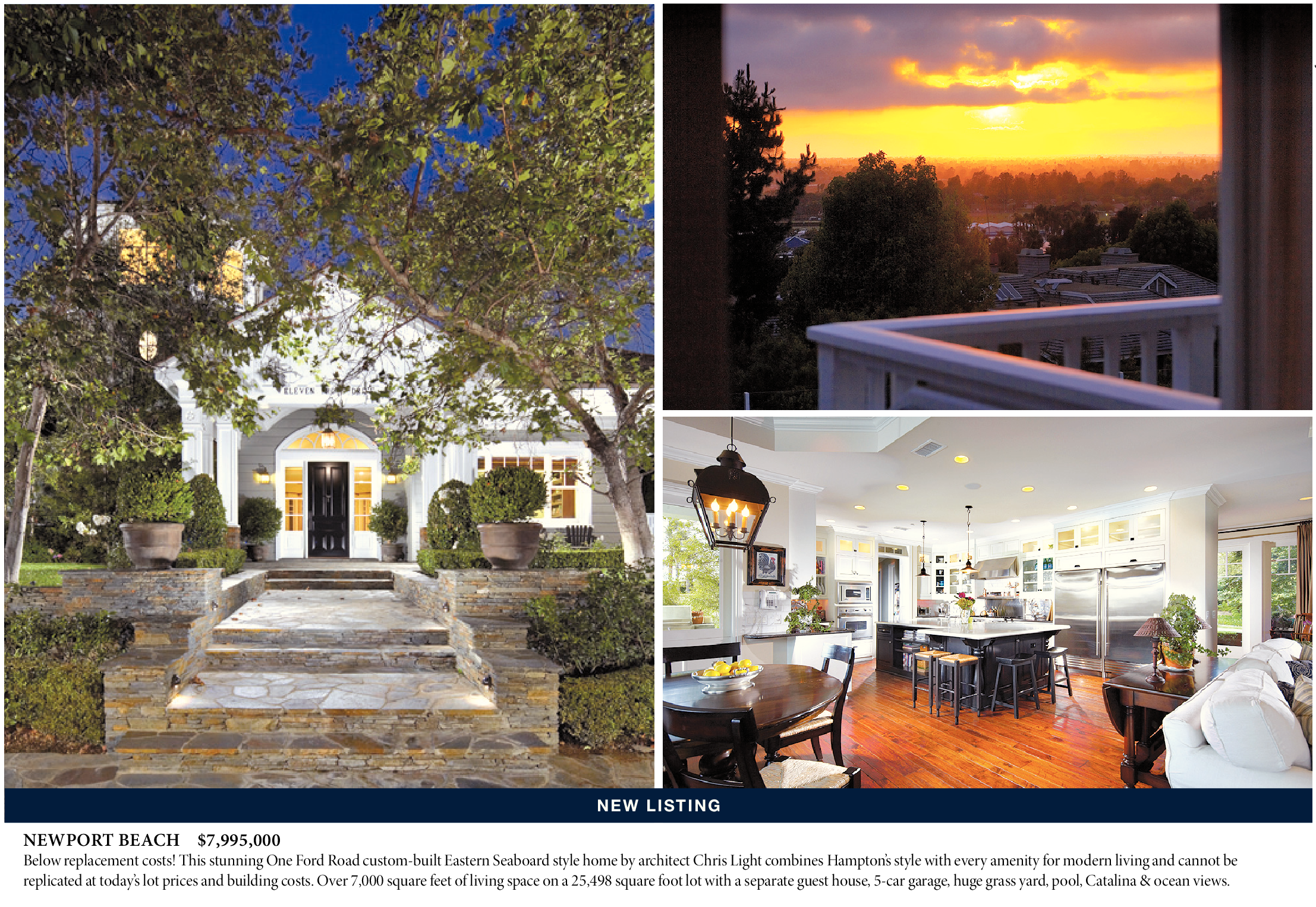 NEWPORT BEACH $7,995,000 Below replacement costs! This stunning One Ford Road custom-built Eastern Seaboard style home by architect Chris Light combines Hampton’s style with every amenity for modern living and cannot be replicated at today’s lot prices and building costs. Over 7,000 square feet of living space on a 25,498 square foot lot with a separate guest house, 5-car garage, huge grass yard, pool, Catalina & ocean views.