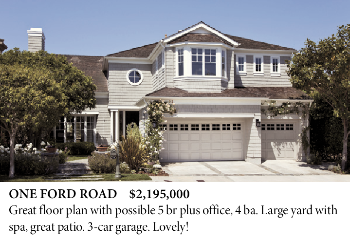 ONE FORD ROAD $2,195,000 Great floor plan with possible 5 br plus office, 4 ba. Large yard with spa, great patio. 3-car garage. Lovely!