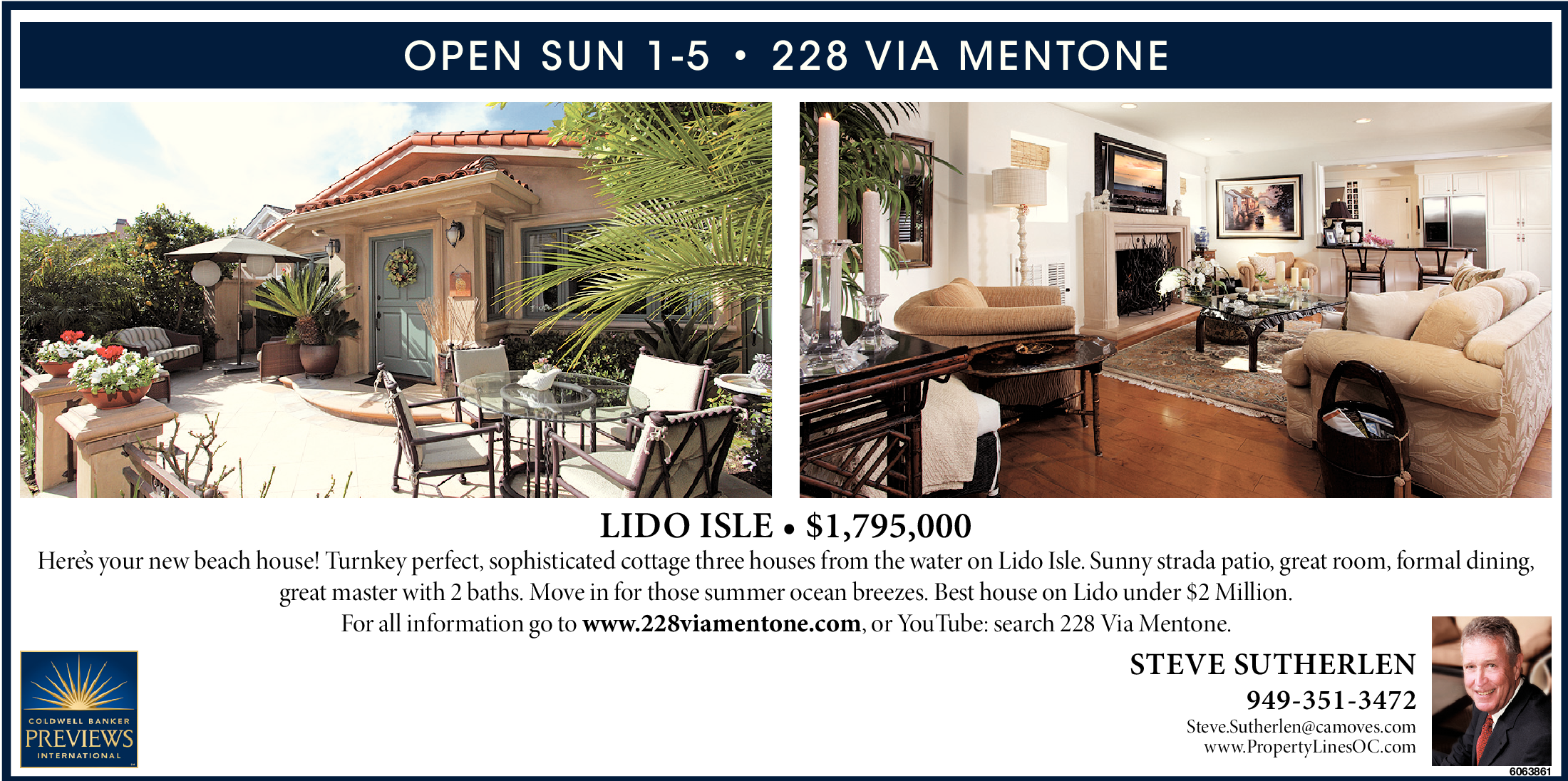 OPEN SUN 1-5 • 228 VIA MENTONE LIDO ISLE • $1,795,000 Here’s your new beach house! Turnkey perfect, sophisticated cottage three houses from the water on Lido Isle. Sunny strada patio, great room, formal dining, great master with 2 baths. Move in for those summer ocean breezes. Best house on Lido under $2 Million. For all information go to www.228viamentone.com, or YouTube: search 228 Via Mentone. STEVE SUTHERLEN 949-351-3472 Steve.Sutherlen@camoves.com www.PropertyLinesOC.com 6063861