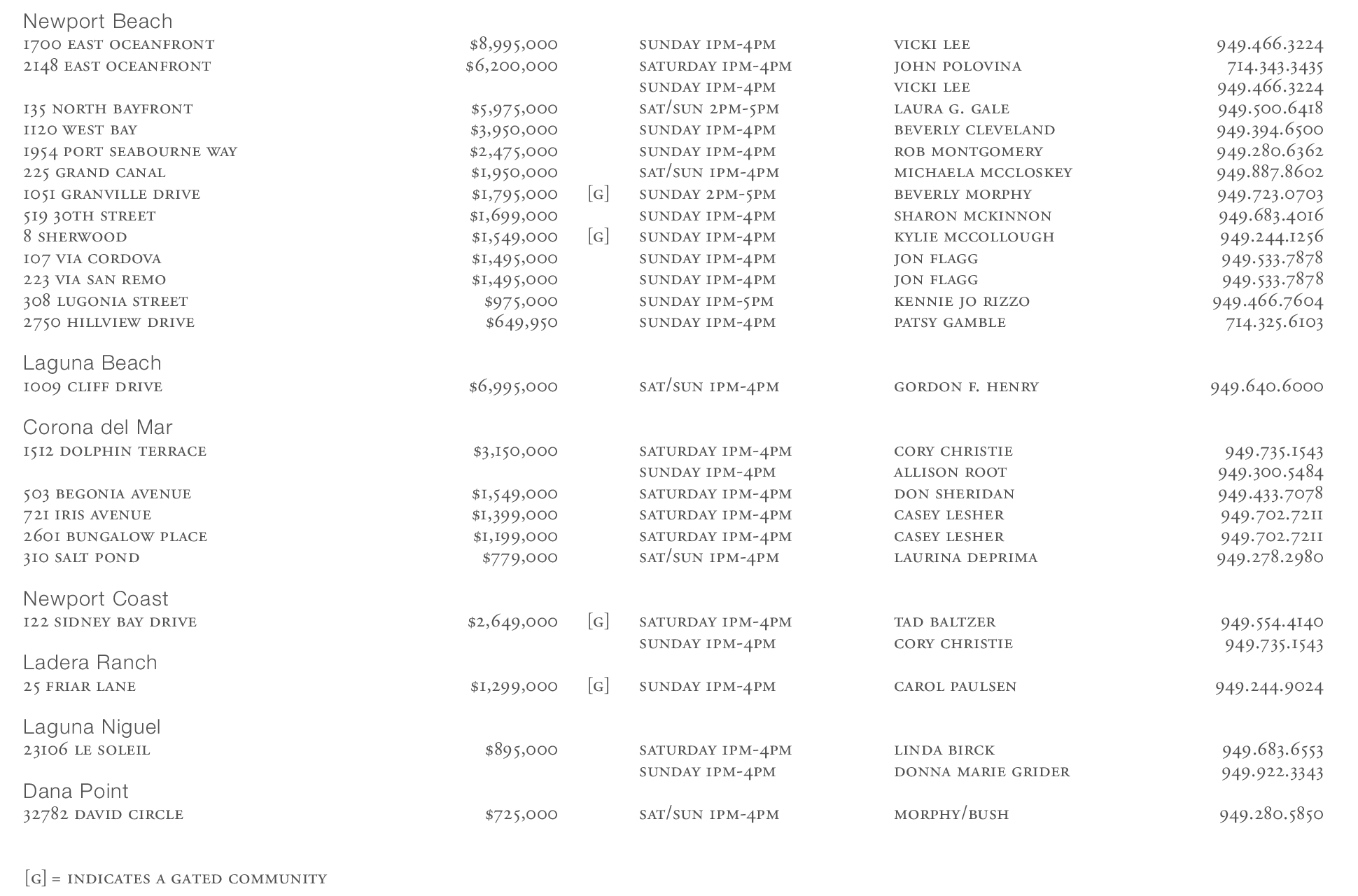 Newport Beach 1700 east oceanfront $8,995,000 sunday 1pm-4pm vicki lee 949.466.3224 2148 east oceanfront $6,200,000 saturday 1pm-4pm john polovina 714.343.3435 sunday 1pm-4pm vicki lee 949.466.3224 135 north bayfront $5,975,000 sat/sun 2pm-5pm laura g. gale 949.500.6418 1120 west bay $3,950,000 sunday 1pm-4pm beverly cleveland 949.394.6500 1954 port seabourne way $2,475,000 sunday 1pm-4pm rob montgomery 949.280.6362 225 grand canal $1,950,000 sat/sun 1pm-4pm michaela mccloskey 949.887.8602 1051 granville drive $1,795,000 [g] sunday 2pm-5pm beverly morphy 949.723.0703 519 30th street $1,699,000 sunday 1pm-4pm sharon mckinnon 949.683.4016 8 sherwood $1,549,000 [g] sunday 1pm-4pm kylie mccollough 949.244.1256 107 via cordova $1,495,000 sunday 1pm-4pm jon flagg 949.533.7878 223 via san remo $1,495,000 sunday 1pm-4pm jon flagg 949.533.7878 308 lugonia street $975,000 sunday 1pm-5pm kennie jo rizzo 949.466.7604 2750 hillview drive $649,950 sunday 1pm-4pm patsy gamble 714.325.6103