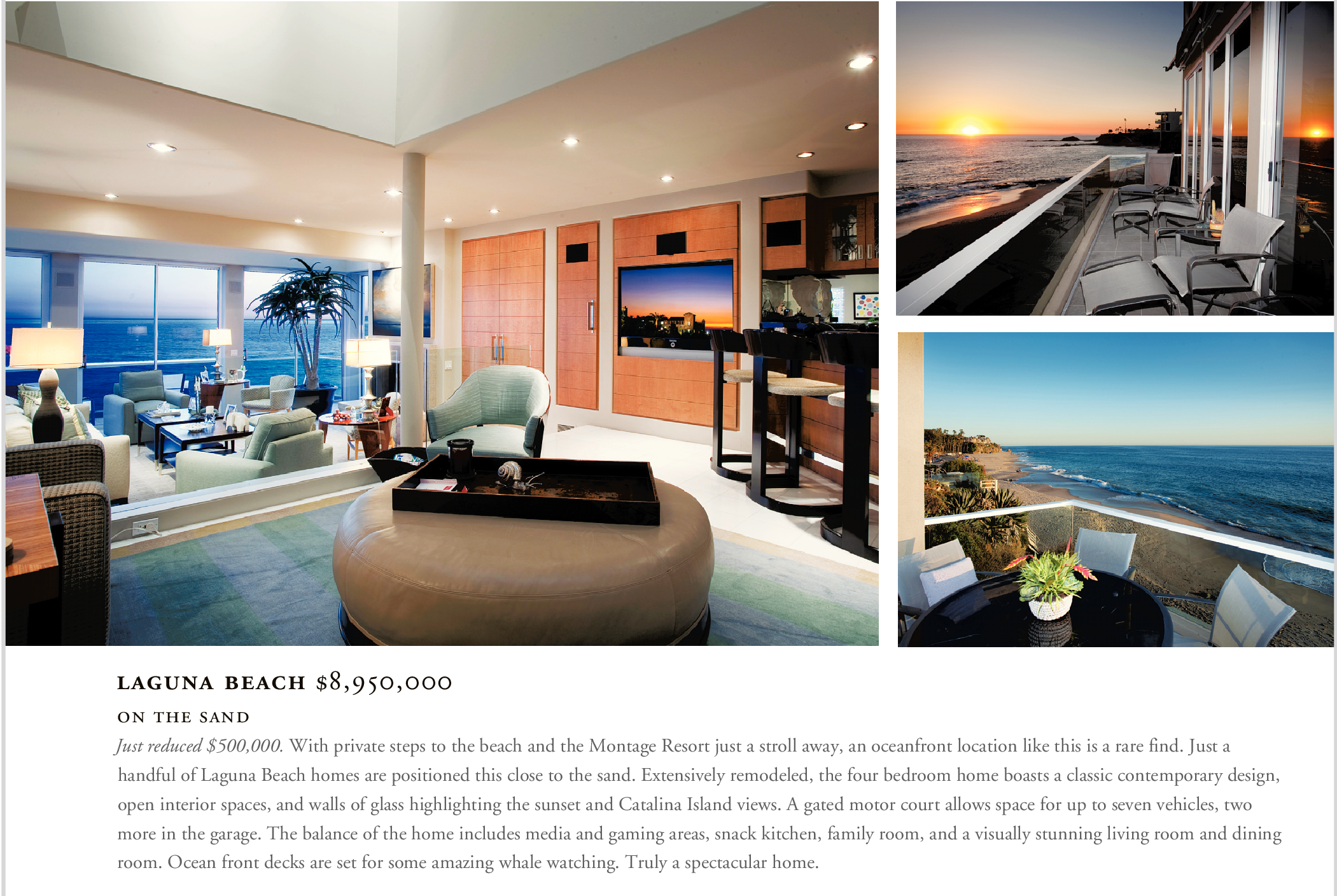 Just reduced $500,000. With private steps to the beach and the Montage Resort just a stroll away, an oceanfront location like this is a rare find. Just a handful of Laguna Beach homes are positioned this close to the sand. Extensively remodeled, the four bedroom home boasts a classic contemporary design, open interior spaces, and walls of glass highlighting the sunset and Catalina Island views. A gated motor court allows space for up to seven vehicles, two more in the garage. The balance of the home includes media and gaming areas, snack kitchen, family room, and a visually stunning living room and dining room. Ocean front decks are set for some amazing whale watching. Truly a spectacular home.