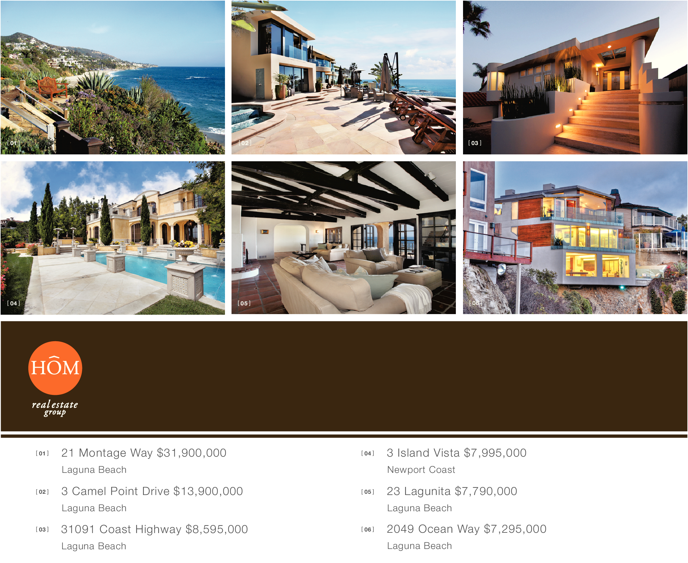 [ 01 ] [ 02 ] [ 03 ] [ 04 ] [ 05 ] [ 06 ] [ 01 ] [ 02 ] [ 03 ] 21 Montage Way $31,900,000 Laguna Beach 3 Camel Point Drive $13,900,000 Laguna Beach 31091 Coast Highway $8,595,000 Laguna Beach 3 Island Vista $7,995,000 Newport Coast [ 04 ] [ 05 ] [ 06 ] 23 Lagunita $7,790,000 Laguna Beach 2049 Ocean Way $7,295,000 Laguna Beach