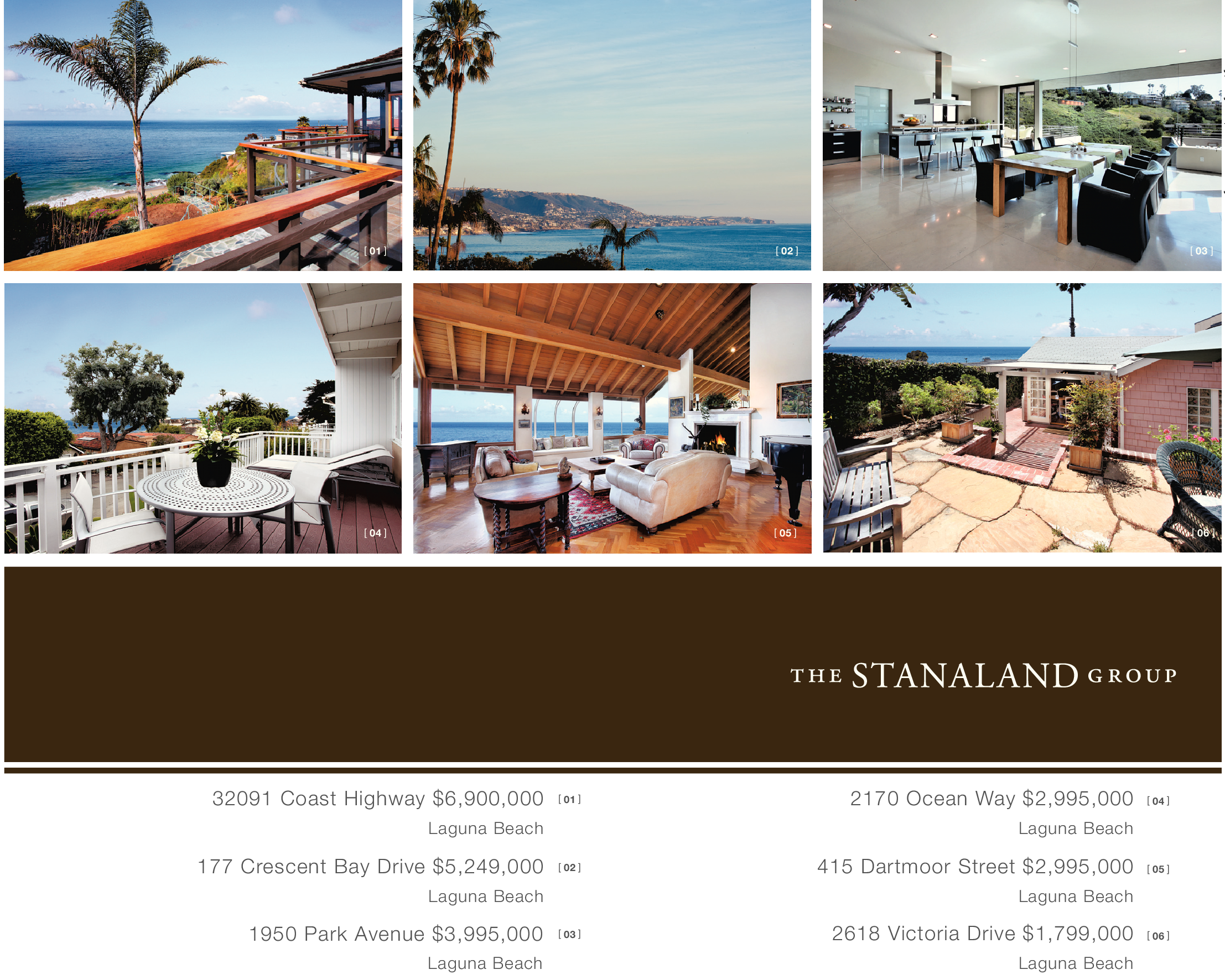 [ 01 ] [ 02 ] [ 04 ] [ 05 ] 32091 Coast Highway $6,900,000 Laguna Beach 177 Crescent Bay Drive $5,249,000 Laguna Beach 1950 Park Avenue $3,995,000 Laguna Beach [ 01 ] [ 02 ] [ 03 ] 2170 Ocean Way $2,995,000 Laguna Beach 415 Dartmoor Street $2,995,000 Laguna Beach 2618 Victoria Drive $1,799,000 Laguna Beach [ 04 ] [ 05 ] [ 06 ] [ 03 ] [ 06 ]