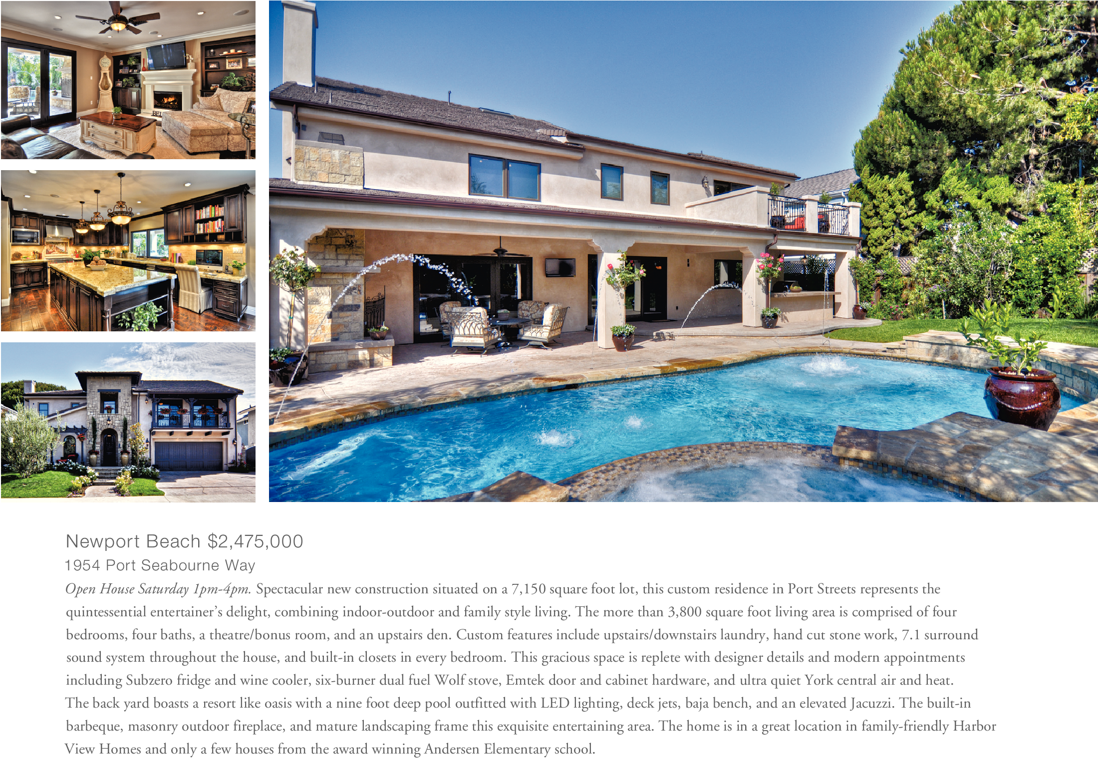 1954 Port Seabourne Way Open House Saturday 1pm-4pm. Spectacular new construction situated on a 7,150 square foot lot, this custom residence in Port Streets represents the quintessential entertainer’s delight, combining indoor-outdoor and family style living. The more than 3,800 square foot living area is comprised of four bedrooms, four baths, a theatre/bonus room, and an upstairs den. Custom features include upstairs/downstairs laundry, hand cut stone work, 7.1 surround sound system throughout the house, and built-in closets in every bedroom. This gracious space is replete with designer details and modern appointments including Subzero fridge and wine cooler, six-burner dual fuel Wolf stove, Emtek door and cabinet hardware, and ultra quiet York central air and heat. The back yard boasts a resort like oasis with a nine foot deep pool outfitted with LED lighting, deck jets, baja bench, and an elevated Jacuzzi. The built-in barbeque, masonry outdoor fireplace, and mature landscaping frame this exquisite entertaining area. The home is in a great location in family-friendly Harbor View Homes and only a few houses from the award winning Andersen Elementary school.