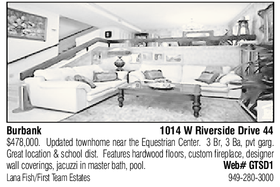 Burbank 1014 W Riverside Drive 44 $478,000. Updated townhome near the Equestrian Center. 3 Br, 3 Ba, pvt garg. Great location & school dist. Features hardwood floors, custom fireplace, designer wall coverings, jacuzzi in master bath, pool. Web# GTSD1 Lana Fish/First Team Estates 949-280-3000
