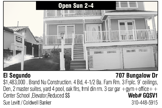 El Segundo 707 Bungalow Dr $1,483,000 . Brand Nu Construction. 4 Bd, 4-1/2 Ba. Fam Rm. 3 Frplc. 9’ ceilings, Den, 2 master suites, yard 4 pool, oak flrs, frml din rm. 3 car gar +gym+office++ Center School ,Elevator,Reduced $$ Web# GQSV1 Sue Levitt / Coldwell Banker 310-448-5915