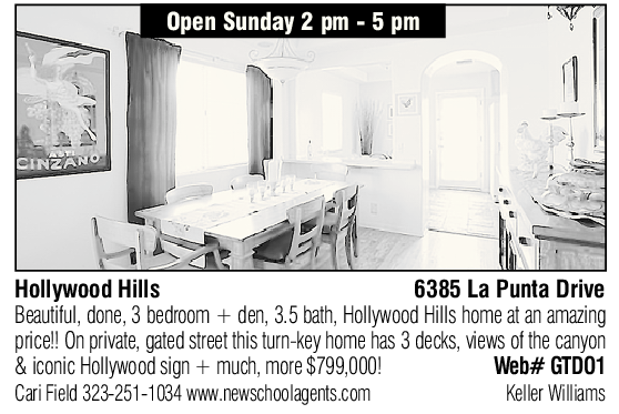 Hollywood Hills 6385 La Punta Drive Beautiful, done, 3 bedroom + den, 3.5 bath, Hollywood Hills home at an amazing price!! On private, gated street this turn-key home has 3 decks, views of the canyon & iconic Hollywood sign + much, more $799,000! Web# GTDO1 Cari Field 323-251-1034 www.newschoolagents.com Keller Williams