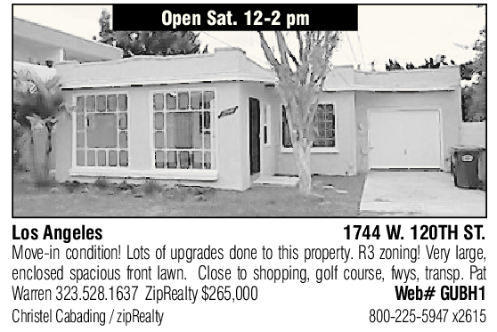 Los Angeles 1744 W. 120TH ST. Move-in condition! Lots of upgrades done to this property. R3 zoning! Very large, enclosed spacious front lawn. Close to shopping, golf course, fwys, transp. Pat Warren 323.528.1637 ZipRealty $265,000 Web# GUBH1 Christel Cabading / zipRealty 800-225-5947 x2615