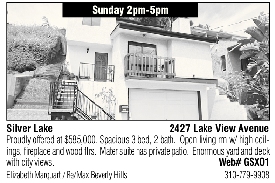 Silver Lake 2427 Lake View Avenue ings, fireplace and wood flrs. Mater suite has private patio. Enormous yard and deck Proudly offered at $585,000. Spacious 3 bed, 2 bath. Open living rm w/ high ceil- with city views. Web# GSXO1 Elizabeth Marquart / Re/Max Beverly Hills 310-779-9908