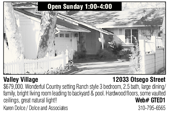 Valley Village 12033 Otsego Street $679,000. Wonderful Country setting Ranch style 3 bedroom, 2.5 bath, large dining/ family, bright living room leading to backyard & pool. Hardwood floors, some vaulted ceilings, great natural light!! Web# GTED1 Karen Dolce / Dolce and Associates 310-795-6565