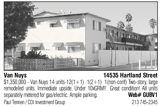 Van Nuys 14535 Hartland Street $1,350,000 - Van Nuys 14 units-12(1+1) 1(2+1) 1(non-conf) Two-story, large remodeled units. Immediate upside. Under 10xGRM!! Great condition! All units separately metered for gas/electric. Ample parking. Web# GUBV1 Paul Tennen / CDI Investment Group 213 745-2345