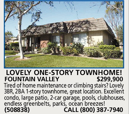 FOUNTAIN VALLEY $299,900 Tired of home maintenance or climbing stairs? Lovely 3BR, 2BA 1-story townhome, great location. Excellent condo, large patio, 2-car garage, pools, clubhouses, endless greenbelts, parks, ocean breezes! (508838) CALL (800) 387-7940