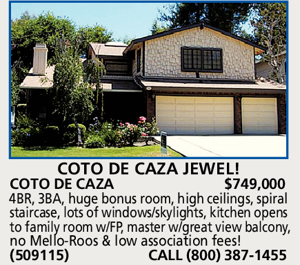 COTO DE CAZA JEWEL! COTO DE CAZA $749,000 4BR, 3BA, huge bonus room, high ceilings, spiral staircase, lots of windows/skylights, kitchen opens to family room w/FP, master w/great view balcony, no Mello-Roos & low association fees! (509115) CALL (800) 387-1455
