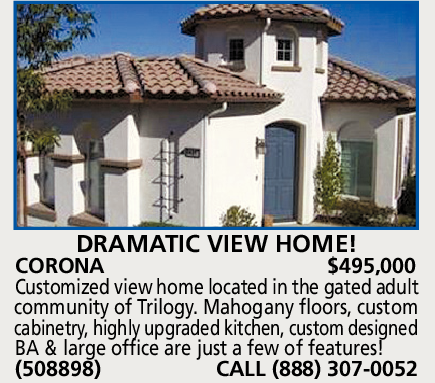 DRAMATIC VIEW HOME! CORONA $495,000 Customized view home located in the gated adult community of Trilogy. Mahogany floors, custom cabinetry, highly upgraded kitchen, custom designed BA & large office are just a few of features! (508898) CALL (888) 307-0052
