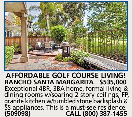RANCHO SANTA MARGARITA $535,000 Exceptional 4BR, 3BA home, formal living & dining rooms w/soaring 2-story ceilings, FP, granite kitchen w/tumbled stone backsplash & SS appliances. This is a must-see residence. (509098) CALL (800) 387-1455
